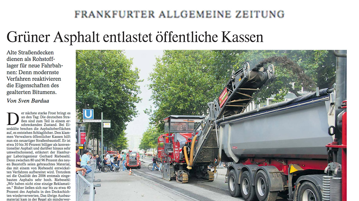 ... Innovation: Saving money is no magic! Made possible by a new wax-oil additive that is added to the carefully milled old asphalt in the heating process. The result: a regenerated pavement that is just as stable and flexible as a new one, but 30% cheaper...